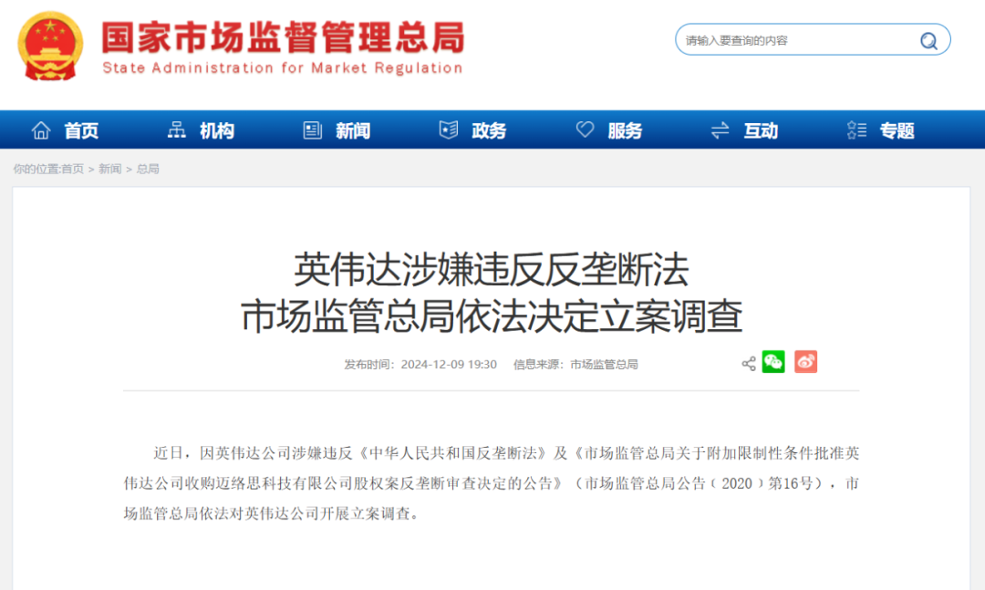 12月9日晚间,国家市场监督管理总局突然发文,称英伟达涉嫌违反反垄断法,市场监管总局依法决定立案调查。